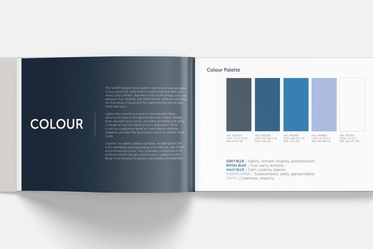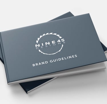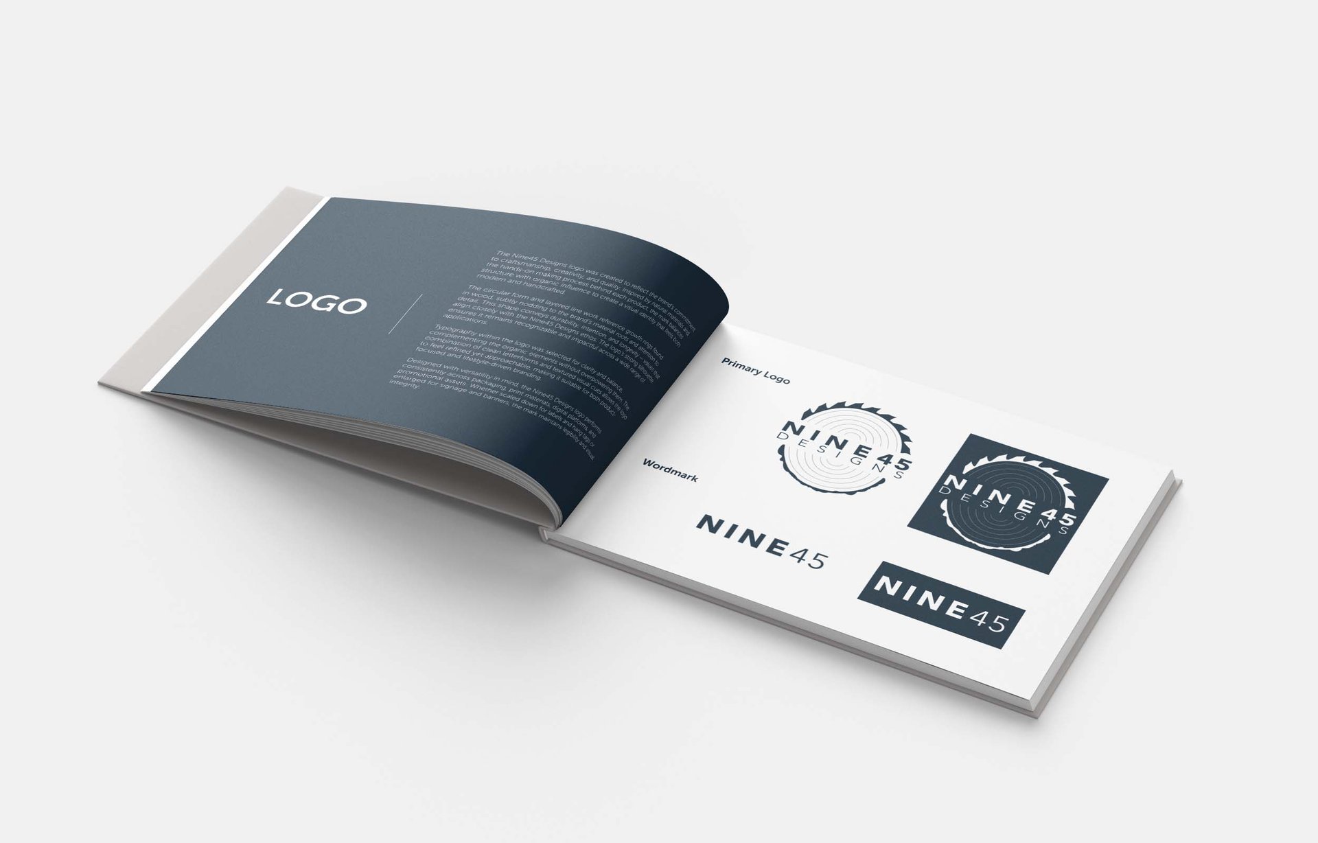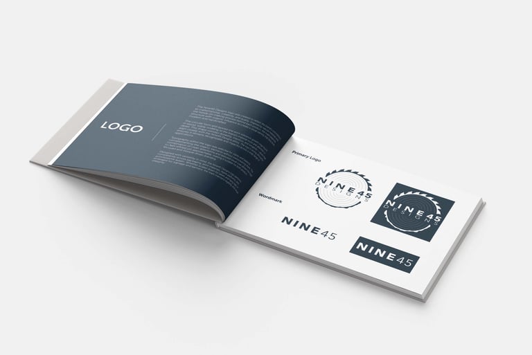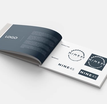 A comprehensive set of brand guidelines created to ensure consistent use of the Nine45 Designs logo, colour palette, typography, and imagery across all platforms.